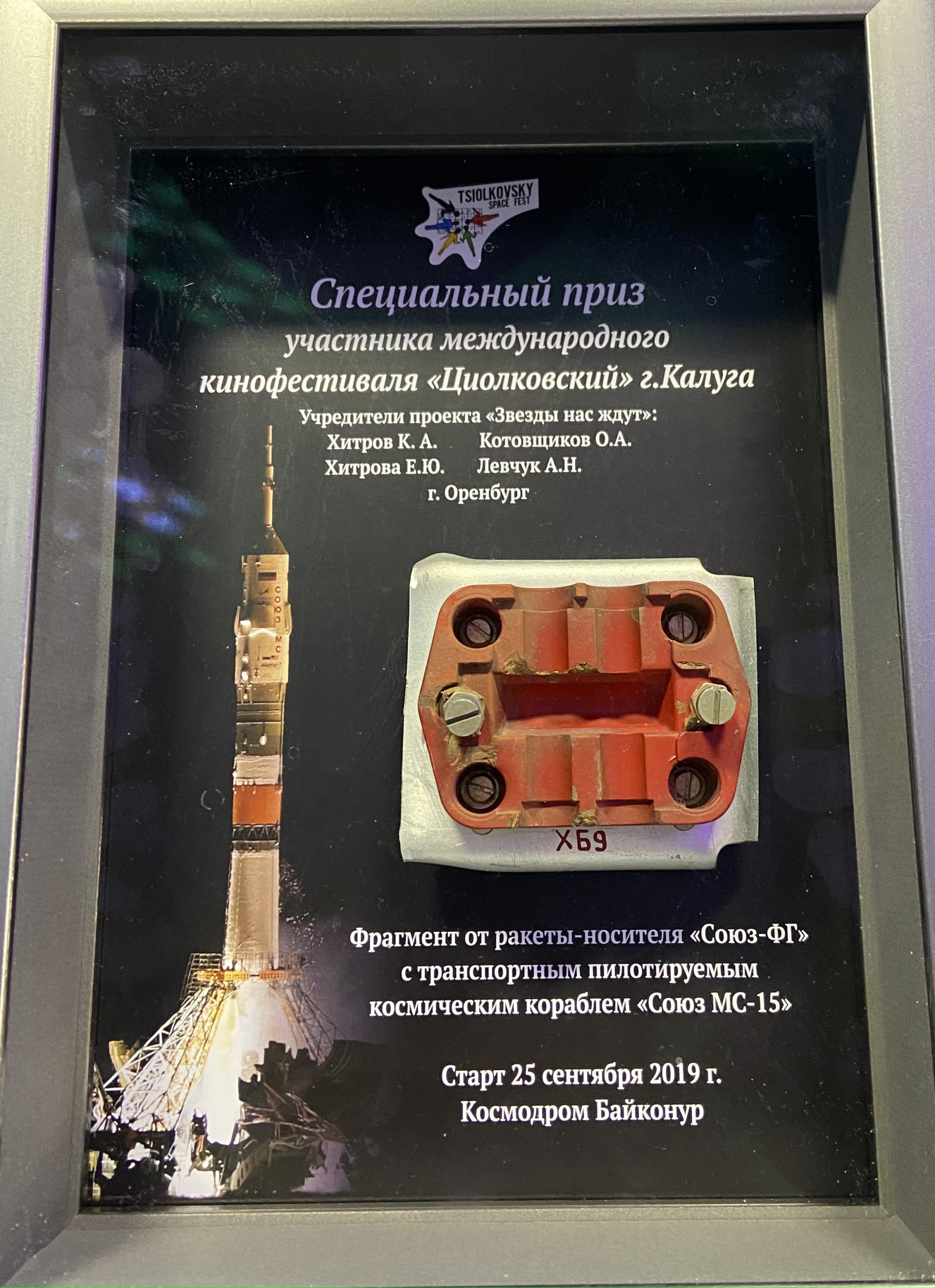 Маша и Вова Федоровы, создатели проекта получили спецприз кинофестиваля — фрагмент от ракеты-носителя “Союз-ФГ”, старт был 25 сентября 2019 г. Это настоящий музейный экспонат.